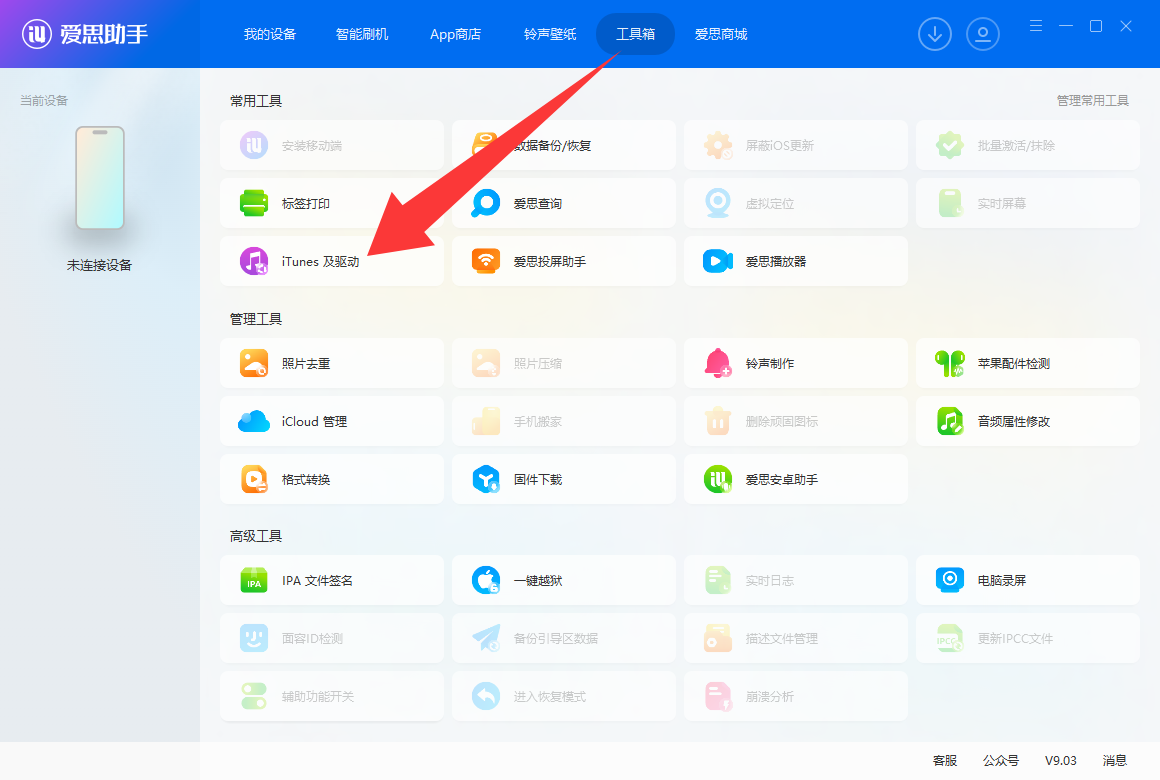 4.打开爱思助手,点击“工具箱->iTunes 及驱动->安装 iTunes”来安装 iTunes。